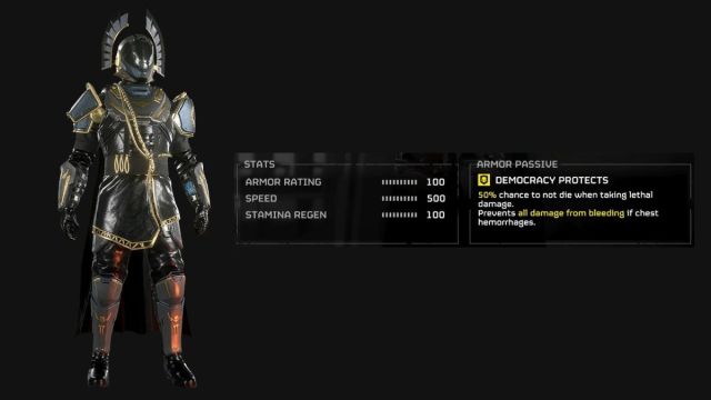 What’s neat about this particular armor set is the passive bonus you receive called “Democracy Protects,” which gives you a 50% chance to survive when taking lethal damage and prevents all damage from bleeding by chest hemorrhages.