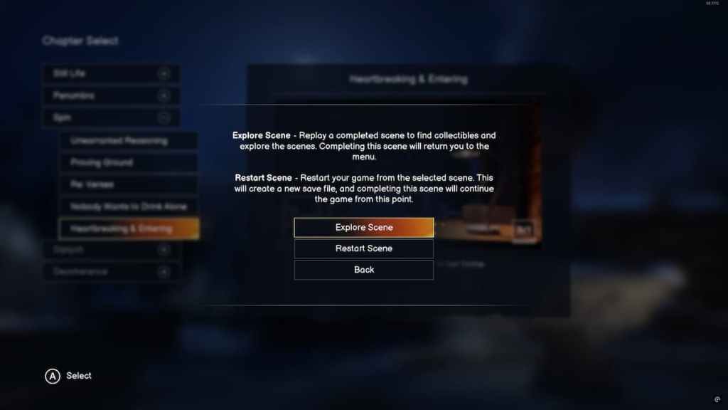 If you missed any collectible during your regular playthrough, you can jump back into any chapter and individual subchapters to explore around and skip through the dialogue with the “Explore Scene” option.