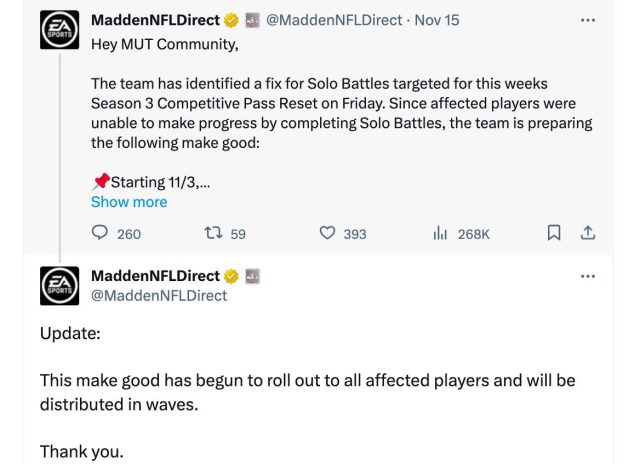 The downtime was brief, with all game modes in Madden’s returning to service before midday ET. There have been no error messages when signing into any of the game modes or playing online.