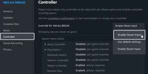 • In the Controller tab, select the Disable Steam Input option under Override for Mecha BREAK.