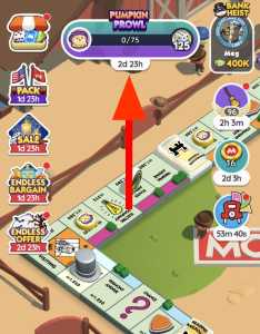 Pumpkin Prowl is a limited-time, four-day event in Monopoly GO that spawns scarecrow tokens around the board for you to collect. You’ll gain points toward rewards as you land on these tiles and pick up the tokens, and you can view your progress by tapping the “Pumpkin Prowl” event bar below your money counter.