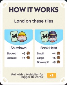 As with all events, your current dice multiplier will affect points earned, so a x5 multiplier can get you 20 points at once instead of 4 in a small Heist. Another good reason to always go for all the free dice you can find!