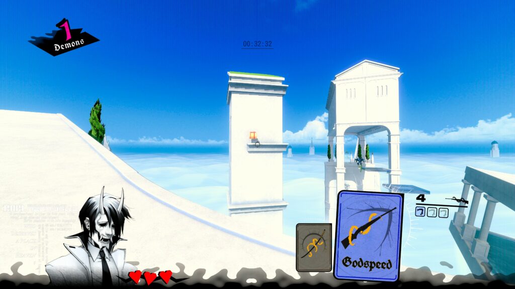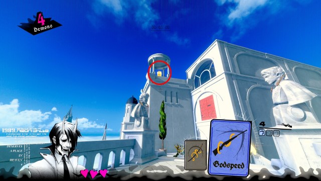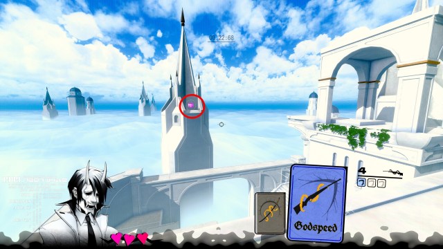 For this one, you’ll need to shoot all of the blue enemies (not dash) to clear them out and obtain three Godspeed cards. This is at the very beginning of the level. Once you have three, jump on the small lip from the second archway. When you’re on the lip closest to the building with the gift, jump and use the full length of all three dashes. You’ll just be able to catch the tiny ledge on the front of the building. Then you can hop over the railing and grab the gift.