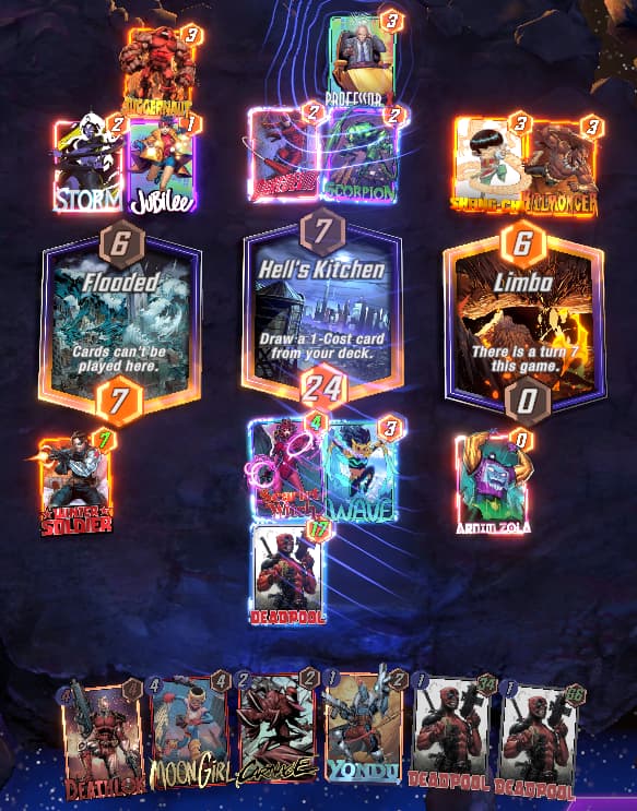 Our Arnim Zola resolved itself before Professor X got flipped. Shang Chi killed one Deadpool and Death. The Storm on the left side was too late; we already resolved Bucky Barnes and Deadpool about three times. You must act fast against this Location if you are playing a counter-deck. So, it might be better to run a Deadpool / Deathwave deck and just ride the wave.