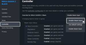 - In the Controller tab, select the Disable Steam Input option under Override for Ninja Gaiden 2 Black