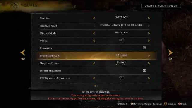 If you are consistently hitting 60 or 120 FPS, the camera stutter disappears entirely, resulting in a smooth presentation. Nioh 3 does not support an uncapped frame rate, so you will need to lock the game to either 60 or 120 FPS through the in-game settings. You can find this specific setting in the Visuals section.