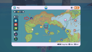 Head to the Casseroya Lake Islet waypoint in Paldea. This is the waypoint dead center of Casseroya Lake. Then, go northwest, until you hit the sea. You’ll find a smattering of rocks, including three uniform stone pillars.