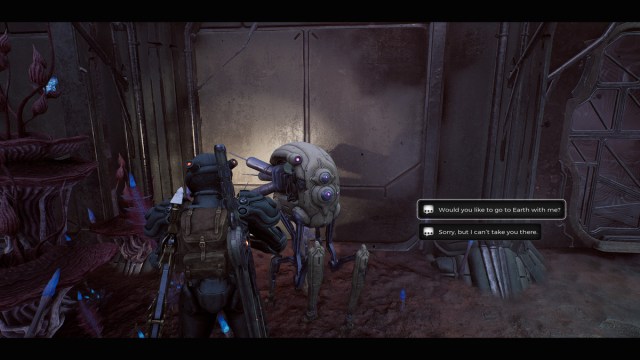 Once you’ve located Spark, regardless of which location it appears in, be sure to exhaust all of its dialogue. Spark is an inquisitive robot interested in exploring new worlds—particularly Earth. For this reason, you should respond positively when Spark asks about going to Earth. In the first interaction, make sure you select the following answers: