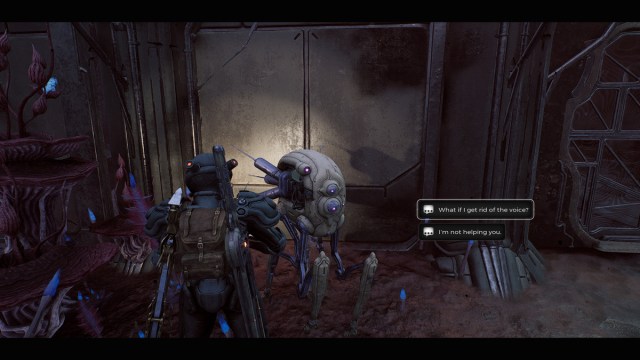 The term “get rid of the voice,” means you will need to defeat Alepsis-Taura, the final boss of the DLC. To progress the Spark questline, you’ll need to defeat Alepsis-Taura and then return to Spark. Once this is done, interact with the robot again at any location it spawns, as we mentioned above, and this should be your answer: