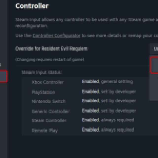 • In the Controller tab, select the Disable Steam Input option under Override for Resident Evil Requiem.