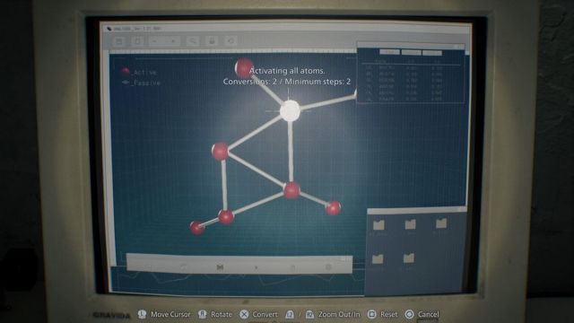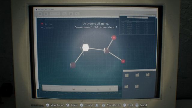 Use the Blood Specimen on the Laser Microscope to analyze it. Select the 2nd cube to turn all five into atoms. This unlocks Handgun Ammo and Hemolytic Injectors for crafting. Use the Blood Collector to collect blood near the bucket, and that should be it for this room.