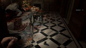 By the bar counter, there’s another handgun, the S&S M232. This one has a 9-round magazine capacity, which is actually full when you pick it up. If you run out of ammo, run to it to deal with the enemies here. You can also run toward the balcony, and there’s some handgun ammo on the floor. If things are clear, you can start looking around. There’s an Antique Coin by the piano keys and a Green Herb by one of the tables. There’s also a safe by the bar counter, but you’ll need the combination first.