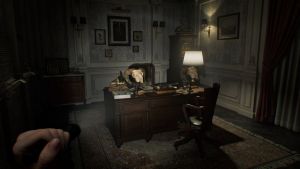 Run to the next hallway, and you’ll see another balcony on the left. There’s a note by the jacket, handgun ammo on the table, and a green herb by the other table. Enter the Chairman’s Office here and ignore the locked drawer since you need a lockpick.