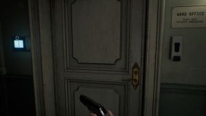 Exit the Custodian’s Office and take the stairs next to you. There should be a box there for some handgun ammo. Go up to the third floor, which is a dead end, but there are two more boxes of handgun ammo. Go back to the 2nd floor and enter the Office. Grab the empty bottle, break the box for some handgun ammo, a lockpick on one of the desks, and read the Background Check notes on the desk.
