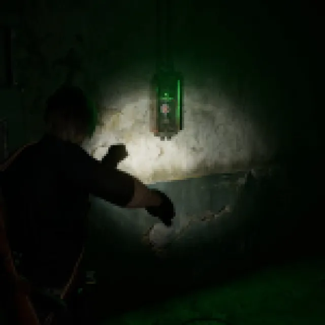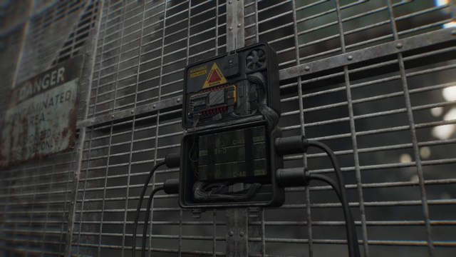 Go up the staircase and follow the path going to the door. Grab the battery from the fuse box. Open the locked door and go straight up the ladder. Go back to the underground parking garage gates with the zombie smashing through. Stealthily eliminate the zombie and place the Battery there. Turn left and take the ladder next to the gate.