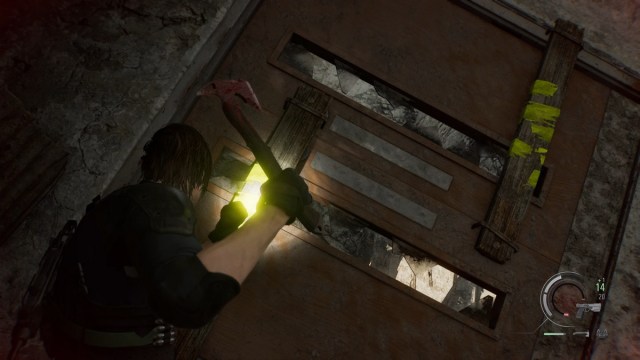 Keep going straight, and you’ll see a door with some wooden planks with yellow tape. Use your hatchet to break it and go inside the office. Grab the green herb and go back.