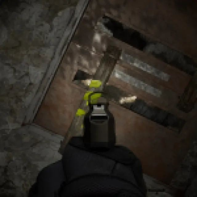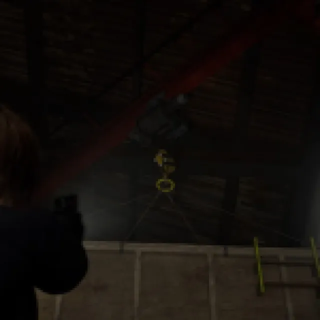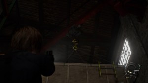 Head straight and shoot the yellow tape on the hanging case above. Head straight past the staircase and shoot the yellow tape on the ladder to go up there and pick up some more items.