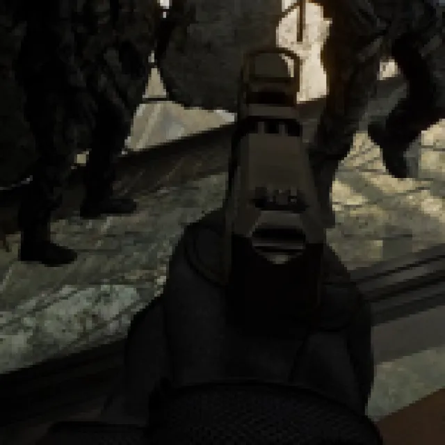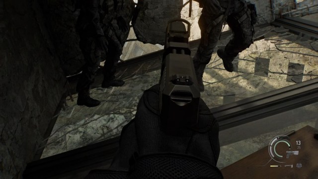 Shoot the glass floor on the right and the one in front. Clear the first floor, and then go back to the glass floor with the shelf. Shoot the glass floor to drop the ramp on top of it and go to the second floor. Get your rifle out and walk up slowly.