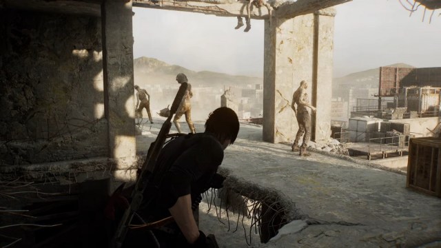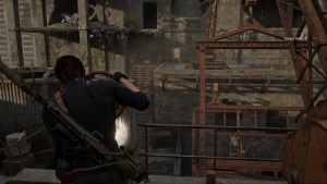 Shoot the BSAA on the third floor first because it sprays with its SMG. Once you make a sound, the other BSAA agents will now come for you, including another one using an SMG on the bridge. Take cover and deal with the BSAA agent approaching you with dynamite, then deal with the other zombie with the SMG, preferably with the rifle as well. Loot everyone and cross the bridge. Jump down the end and turn right to the locked gate.