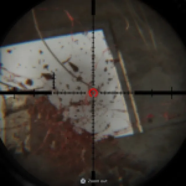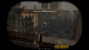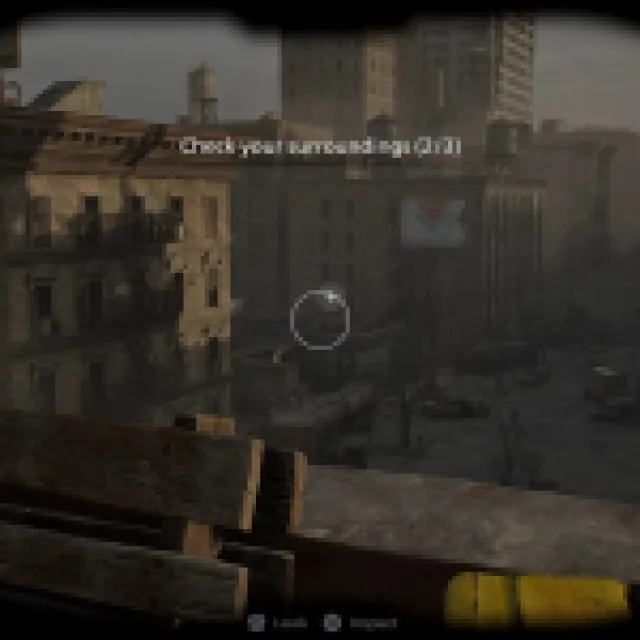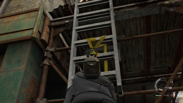 Shoot the yellow tape on the ladder on your left and go up. Open the container and loot some supplies. Go back down and take the stairs going up and use the binoculars to inspect ahead. Turn right and jump down the railing.