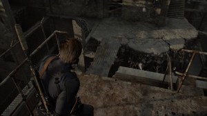 Once you go up again, there’s a zombie holding a propane tank on the right. Shoot it fast with a handgun. Deal with the remaining zombies, and hope you still have enough ammo left. Follow the path and through the door. Use the valve to bring down the scaffolding lift.
