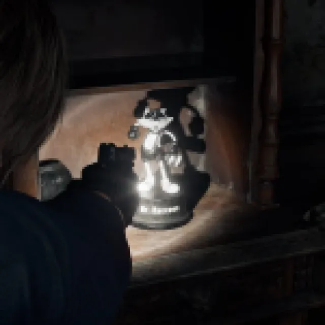 Take the staircase on the left. Head up and keep following the path, and stop at the office. Break the Mr. Raccoon on the shelf.