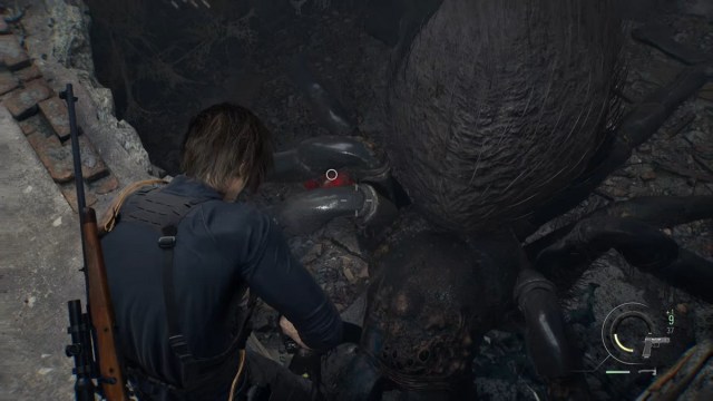 Its weakness is the cysts on the tail. It is tough to shoot them, though. Move to the other side of the building to find a throwable propane tank. Throw it and shoot it to stun the spider boss. Use your rifle to deal maximum damage to the cyst. Keep shooting it normally and you’ll eventually beat the spider boss. Your last shot should trigger the cutscene with Leon beating the spider and ending up at the subway.