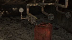 Open the lockers, break the boxes, and grab the empty gas can at the side exit. Go back inside and deal with all the zombies, including the one using the chainsaw. Before grabbing the chainsaw from the zombie when the station is clear, open the door and shoot the zombie holding a propane tank.
