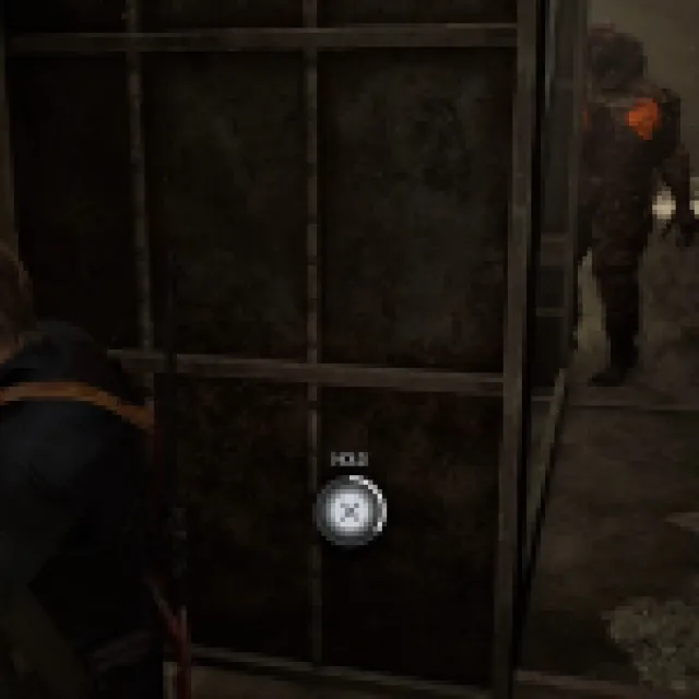 Run up the ramp and stay left. The right container will fall first, and after it passes, switch to the right to avoid the left container. Run straight and slide down to the glass floors. Break the door with the wooden planks. The game will teach you to shoot the glass floors to let the BSAA agent fall instead of fighting them directly. Each glass floor takes two handgun rounds to break.