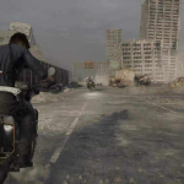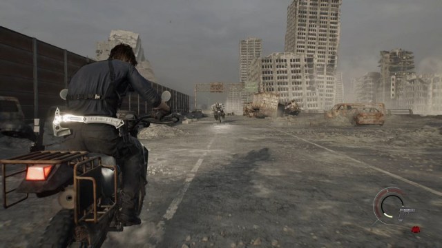 Leon goes for a ride on the motorcycle. Navigate the highway until another cutscene shows up.