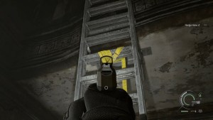 Go straight to the main hallway and take the door on your right. Once you turn right at the corner, Mr. X breaks the wall again on the right. Move back a little and wait for Mr. X to commit to that corner on the left and run to the right where he broke the wall. Go up the stairs and jump across.