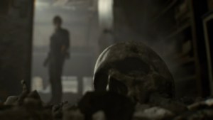 Turn left instead of right and take the hallway. Mr. X will break the wall with a post and start running back to the other side (Chief’s Office). Wait for Mr. X to break through here and run around the hallway, but take the shortcut through the wall Mr. X broke with the post. Exiting here triggers a cutscene.