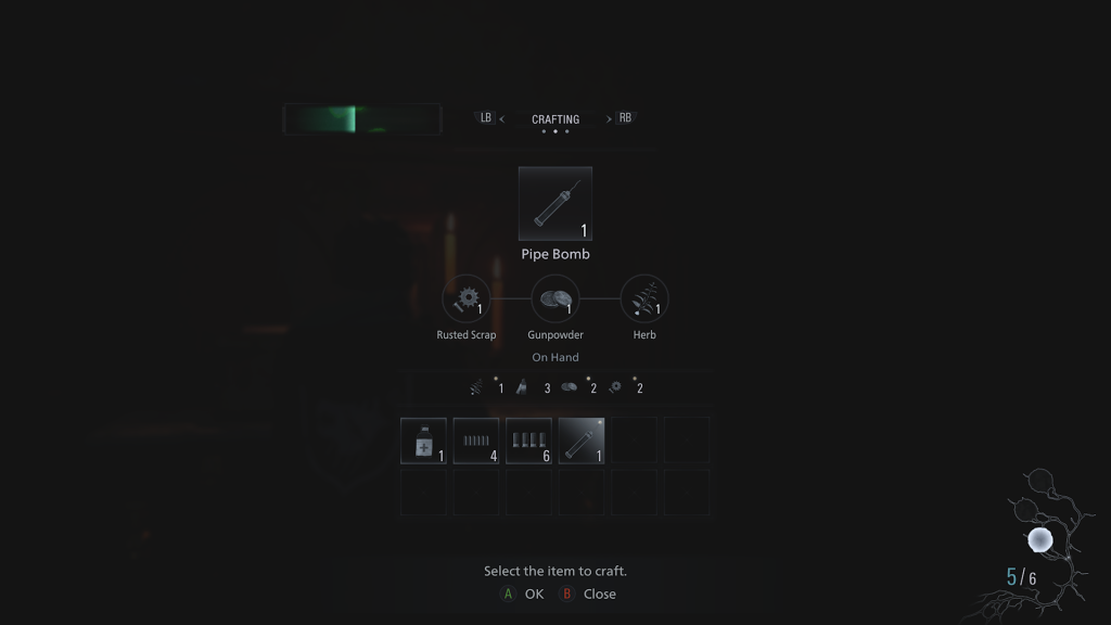 Pipe Bomb – requires Rusted Scrap (x1), Gunpowder (x1), and Herb (x1)
