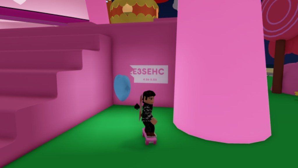 The answer would be the Hello Kitty Ferris Wheel, in this particular instance. Hop on your skateboard by pressing the Q key on your keyboard, or the Skateboard icon on mobile and make haste over to that location. Once you have arrived, you’ll have to hold out on jumping on, as you’ve got to find the second part of the code.