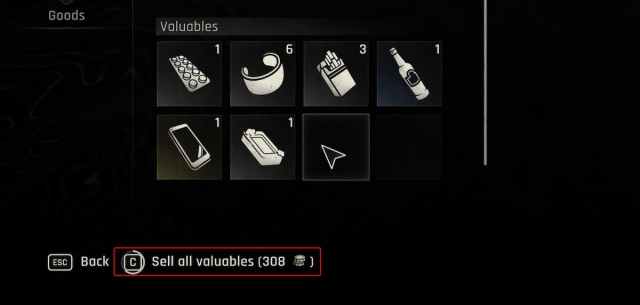 To sell valuables that you currently possess, simply head over to any trader in the game and either sell each valuable item in the “SELL” tab or hold C in the vendor’s screen to sell all available valuables in your inventory.