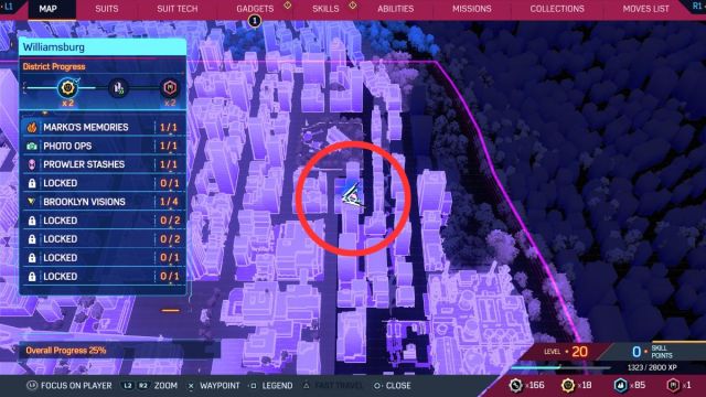 Next, Odyssey requests your help capturing aerial footage of the BVA campus. Head west to a tall building (map screenshot below), where you’ll see yellow and blue smoke. Interact with the drone to start it up, and follow it around the campus by either flying with the Web Wings or swinging with Spider-Man’s regular R2 trigger webs.