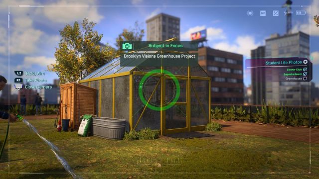 Interact with the broken drone on the roof, which is on some blue tarp next to a red painter’s ladder, and Odyssey will ask you to snap a photo of the Brooklyn Visions Academy campus while you’re up there. Go to the rooftop’s edge, facing the campus, and swipe up on the Touchpad to open the Camera. Get the campus in the frame, then press R1 to take a photograph.