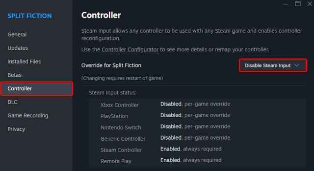 - In the Controller tab, select the Disable Steam Input option under Override for Split Fiction