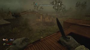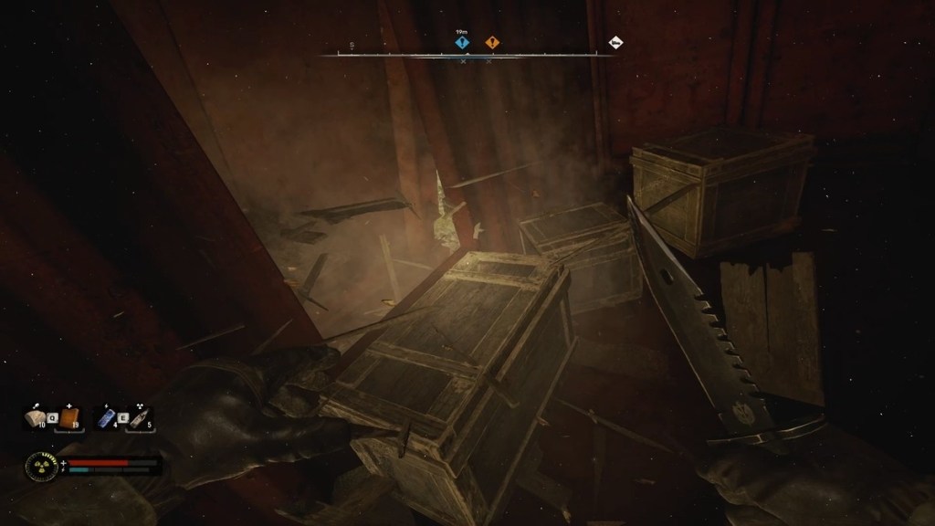 When you try to circle the cabin in hopes of getting inside, you will notice that the two red containers have a lot of breakable wooden boxes. Grab your knife and start smashing the boxes. This will lead you to climb over the second container by making your way through it from the inside.