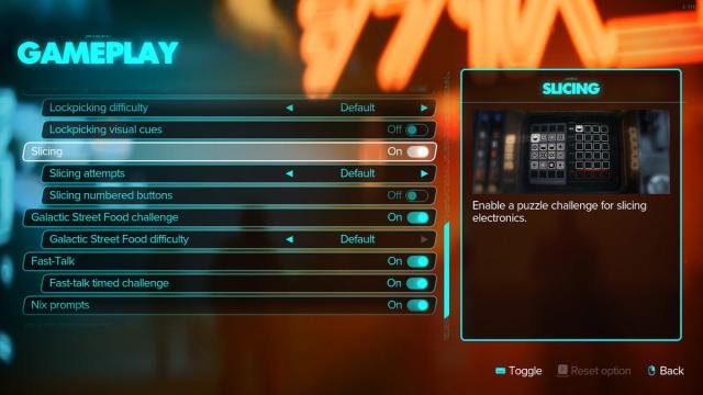 We don’t think it’s as fun as lockpicking, so we recommend turning it off. You can also increase or decrease the slicing attempts and change the glyphs to numbers if you prefer that.