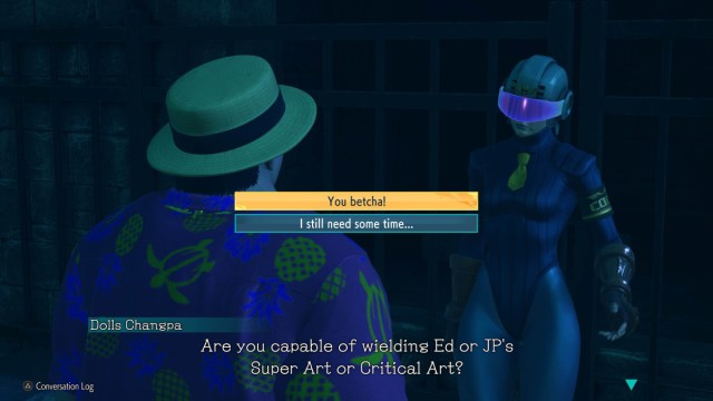 Equip either Ed’s or JP’s Level 1 Super Art, then go to Nayshall again. Travel to your safehouse, change the time to night, then go to the Arena. Speak to Dolls Changpa, who asks you to hit them with a Psycho Power Super Art three times. Don’t worry about meter—you’ll have a full meter for this fight.