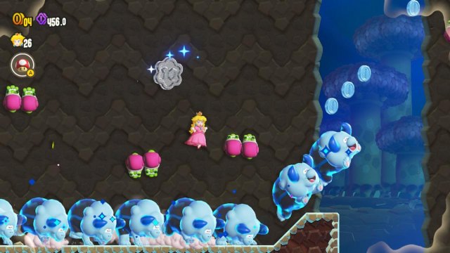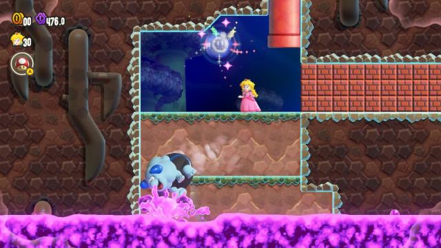 This pipe will transport you to a new area. Jump onto the lone Bulrush above the stone spikes and ride it across the gap. It will jump before it falls into a hole. While it’s doing that, you need to time your own jump to reach the flagpole on the opposite side, earning you the final Wonder Seed.