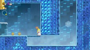 The third coin is past the checkpoint, across from an empty pit and sharp rocks. To collect it, travel on the ice block kicked by an Outmaway and leap onto the platform. Overcoming this challenge can be tricky due to nearby platforms and timing, as there’s a spot you need to jump over to remain on the block. Precise jumps are crucial as falling is also a considerable risk. Consider using a badge like the Parachute Cap to make this jump easier.