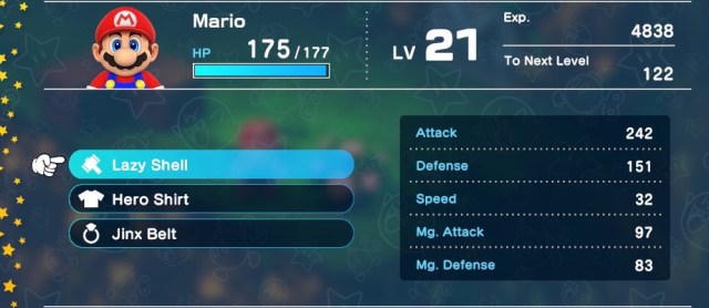 The Jinx Belt gives its wearer immunity to instant death attacks while also boosting their Attack and Defense by 27 points each, and increasing their Speed by 12. This is a good accessory for Mario, who is always in your party and will be mostly on the offensive.