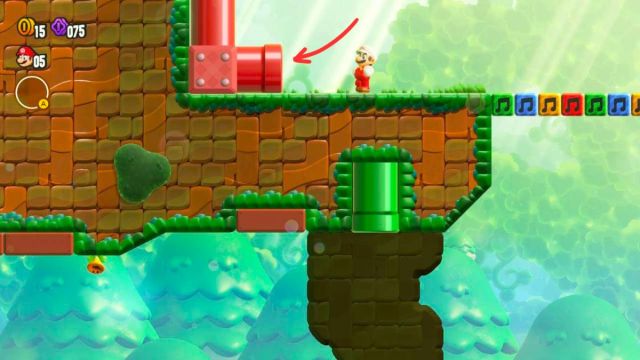 Once the Piranha Plants start singing, continue forward until you see a half-hexagon block with three pipes sticking out of it. Jump up the green pipes to the right of the block, and the Piranha Plants will stop singing. Go across the music note bridge, then turn around and sprint back toward the pipes. Use the first yellow music note block to jump up and land on one of the three pipes sticking out of the half-hexagon block.
