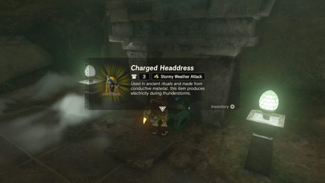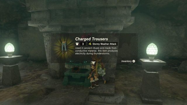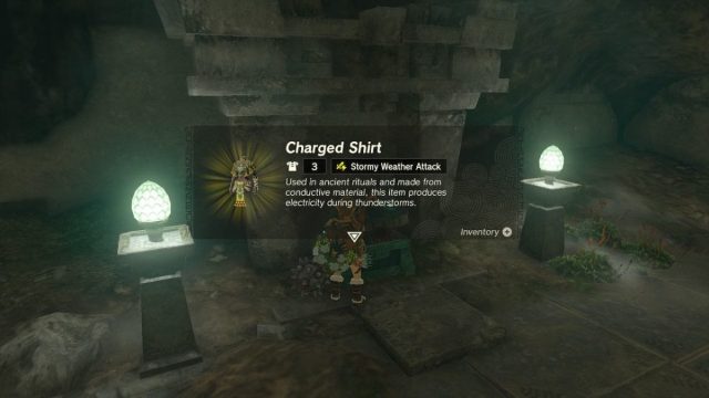 Inside the first door and up the stairs from the stone mural, you’ll find the first piece of the set, the Charged Shirt. After that, talk to him to activate the rest of the mission, where you’ll be instructed to follow the river, find the rest of the pieces, and offer a Zonai Charge as an offering, which is vital to completing the “Guidance from Ages Past” mission, which is still part of the Regional Phenomena main quest.