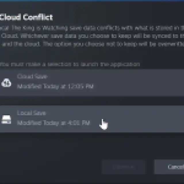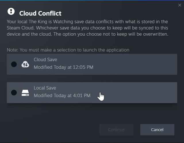• After that, launch The King is Watching again, and Steam will tell you there’s a save conflict.