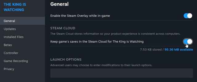 Unfortunately, the game doesn’t have an in-game option to reset progress, which is why deleting the save files is the way to do it. However, since The King is Watching has support for Steam Cloud, you want to disable it first before deleting the save files.