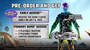 The Foundry Demo will give players access to two playable skaters and two playable parks, along with an early look at the official soundtrack. The Wireframe Tony Shader is a skin for Tony Hawk, which you can check out below.