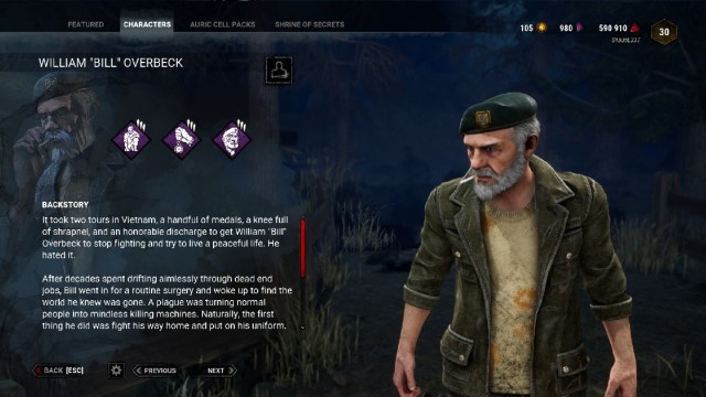 While Bill may have one of the best Survivor perks in the game, with the ability to get himself off of the ground, it may be in your best interest to farm for Bloodpoints with another character. You see, while William looks the part of the grizzled Survivor, the man doesn’t know how to keep quiet. It must be from all the years of smoking or something, but our man Bill here isn’t afraid to be one of DBD’s noisiest survivors.